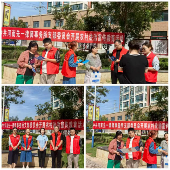9月7日上午,由市司法局、市律师协会主办,中站区司法局等多部门协办的“法律服务进万家,学法普法零距离”的农村法治宣传活动在中站区和美小区开展,河南先一律师事务所王明霞、杨白妮、张朋、孙国帅4位村居法律顾问律师参加了此次活动。